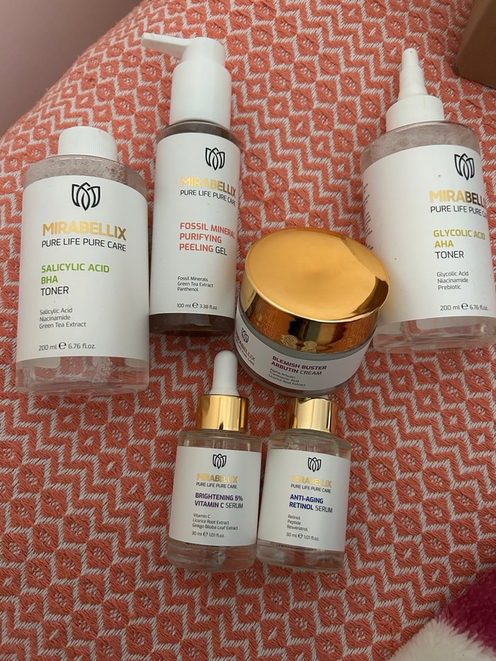 Mirabellix cilt bakım seti; salisilik asit tonik, arındırıcı peeling jel, glikolik AHA tonik, aydınlatıcı ve yaşlanma karşıtı serumlar ile besleyici krem içerir.
