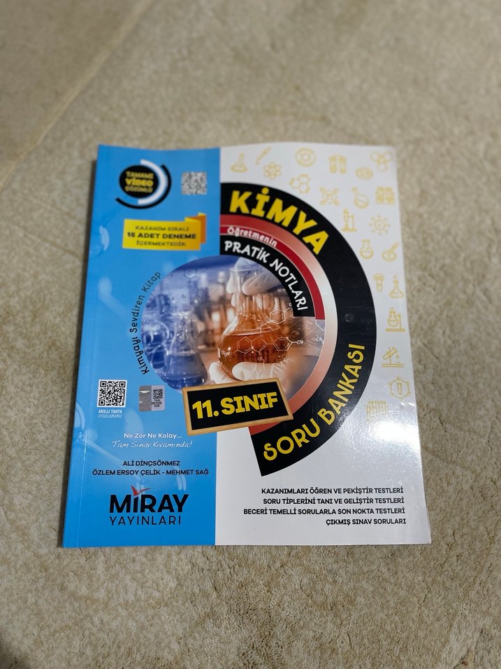 Miray Yayınları 11. sınıf kimya soru bankası, pratik notlar, kazanım testleri ve video çözümlü beceri temelli sorular içerir. Sadece 3-4 test çözülü geri kalanı boş