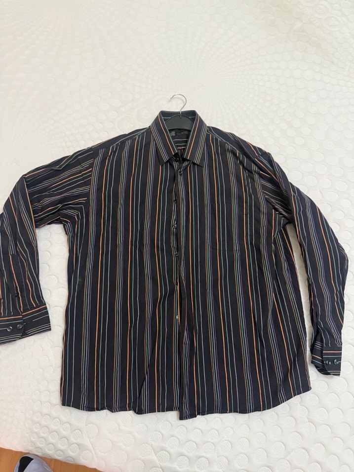 Uzun kollu, yakalı ve düğmeli çok renkli çizgili erkek gömleği. Regular kesim ve midi boyda, günlük ya da ofis kullanımı için uygundur.