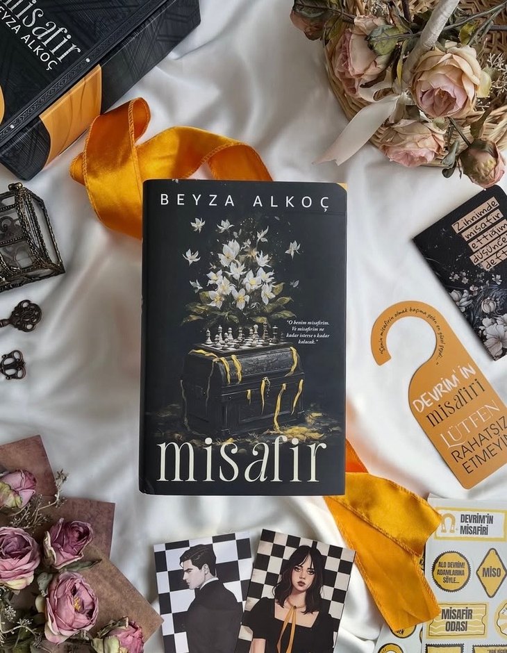 Beyza Alkoç'un "Misafir" romanı, beyaz çiçekler ve satranç taşlarıyla süslü koyu kapak tasarımıyla dikkat çekiyor.