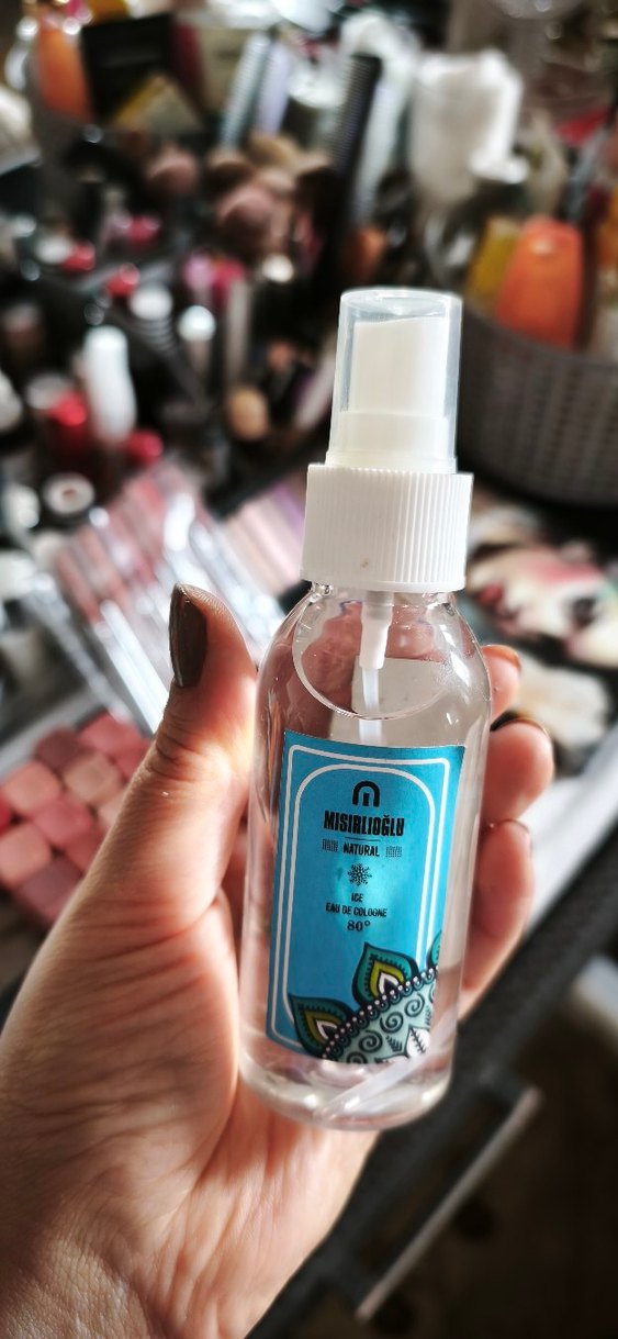 Misirlioğlu çanta kolonyasi, mavi etiketli şeffaf sprey şişede, cildi ferahlatmak ve temizlemek için.
