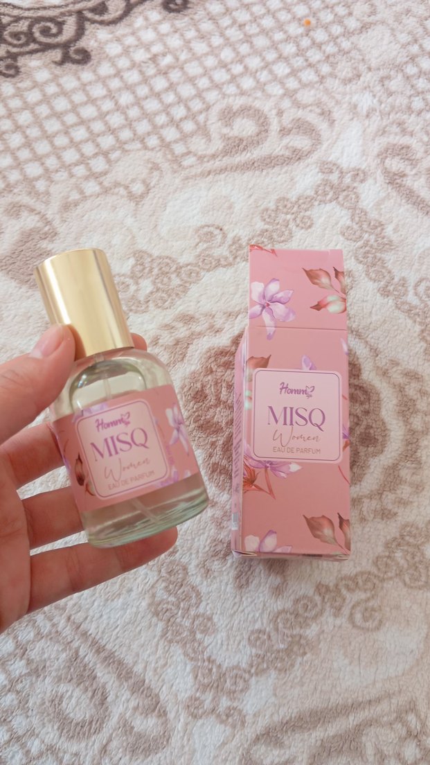 MISQ Honun? kadın parfümü, pembe kutusu ve etiketinde çiçek desenleriyle, şişede altın kapaklıdır. kokusu kalıcı ve çok güzel