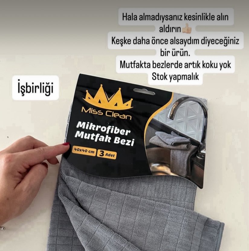 Miss Clean mikrofiber mutfak bezleri gri renkte, 3 adet pakette sunulur. Yumuşak, emici ve mutfakta koku yapmaz. Her bez 40x40 cm ölçülerindedir.