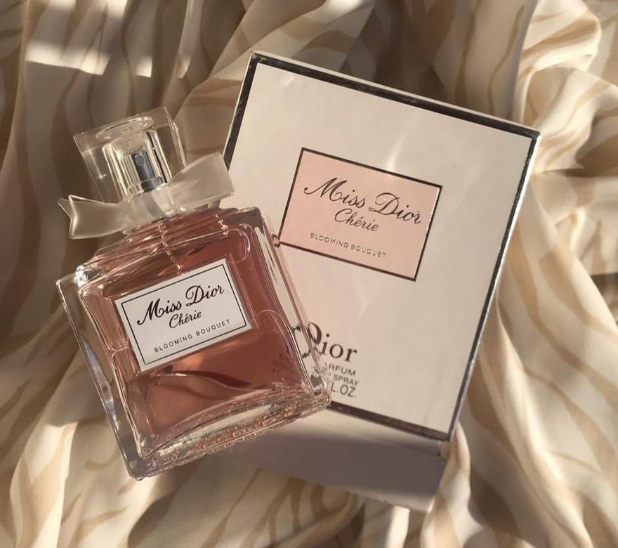 Miss Dior Cherie kadın parfümü, cam şişede fiyonk detayıyla ve blooming bouquet kokusuyla sunulur. Orijinal kutusundadır.