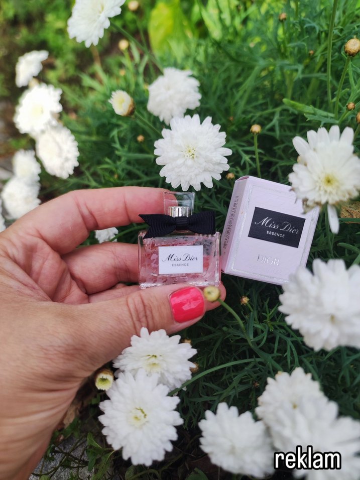 Miss Dior Essence kadın parfümü, siyah fiyonklu şık küçük şişede narin çiçeksi kokuya sahiptir. 5 ml