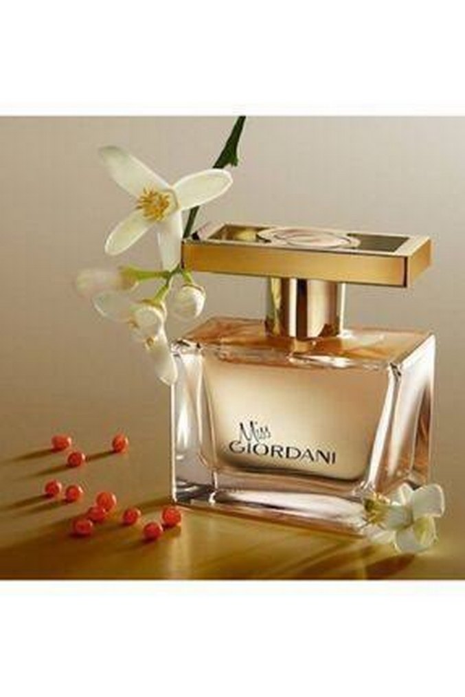 Miss Giordani kadın parfümü, zarif çiçeksi notalara sahip, şık cam şişede altın kapaklı.
