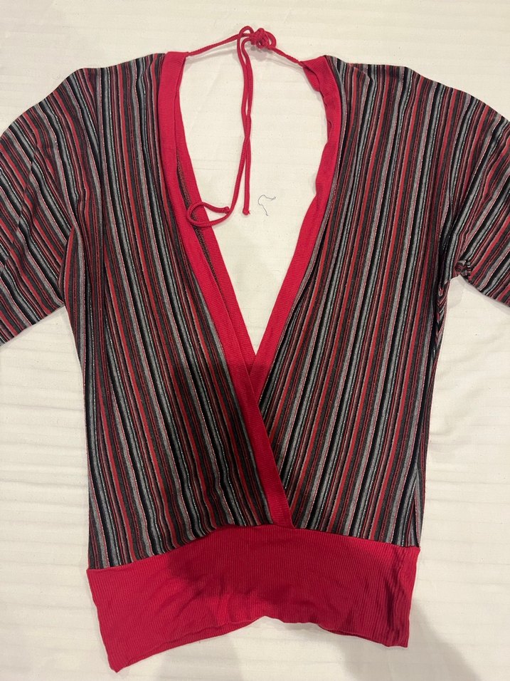 V yaka ve askılı kollara sahip, örgü sentetik kumaştan yapılmış, koyu kırmızı ve çizgili desenli, günlük rahat kullanım için uygun dar kesim kadın bluz. hiçbir defosu yoktur.