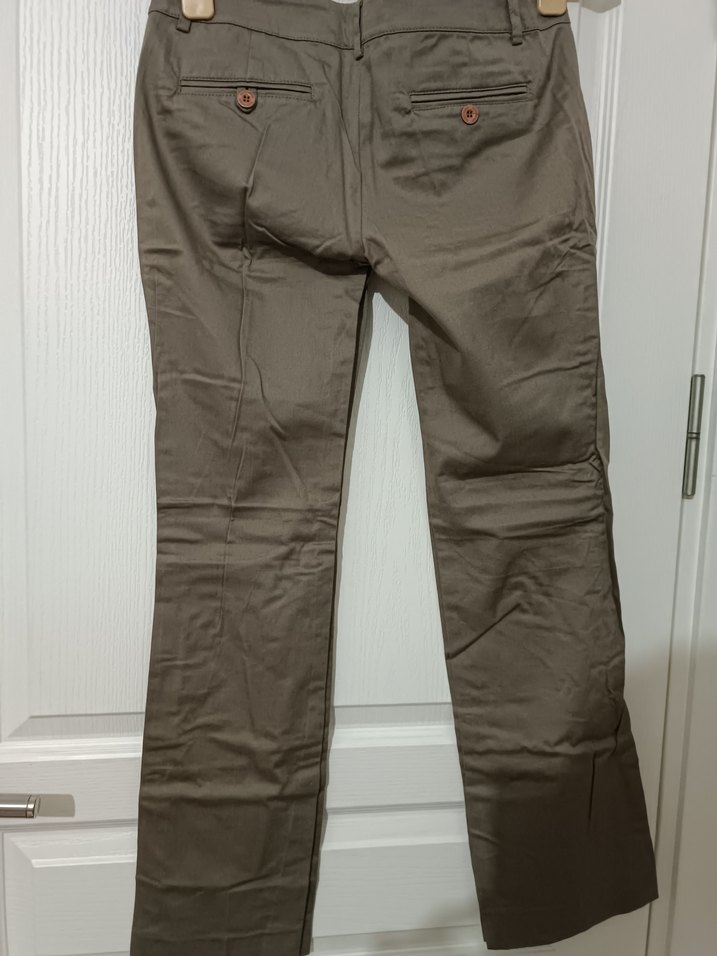 Miss Poem pamuklu haki renk klasik kadın pantolonu, az kullanılmıştır. Small (36) beden, düşük bel ve boru/düz paça kesime sahiptir. İnce dokulu yumuşak kumaşı vardır. Arka ceplidir ve hem günlük hem klasik kombinler için uygundur. Kumaş içeriği: %97 Pamuk, %3 Elastan. İçerik etiketi görsellerde yer almaktadır.