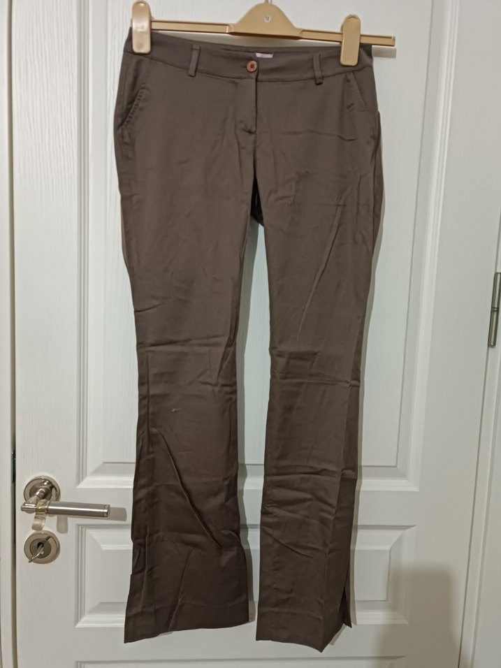 Miss Poem pamuklu vizon renk klasik kadın pantolonu, az kullanılmıştır. Small (36) beden, düşük bel ve boru/düz paça kesime sahiptir. İnce dokulu yumuşak kumaşı vardır. Arka ceplidir ve hem günlük hem klasik kombinler için uygundur. Kumaş içeriği: %97 Pamuk, %3 Elastan. İçerik etiketi görsellerde yer almaktadır.