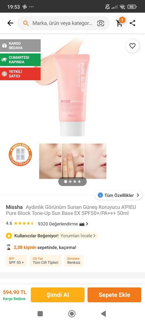 Missha A'PIEU Pure Block Tone-Up Sun Base EX, SPF50+/PA+++ koruma ve aydınlık görünüm sunan pastel pembe tonlu BB kremdir. 50ml tüpte, tüm cilt tiplerine uygundur. ürünün yarısı duruyor. beyaz açık tenliyseniz çok güzel güneş kremi. koyu tenlilere olmaz. sürünce direk beyazlık aydınlık veriyor