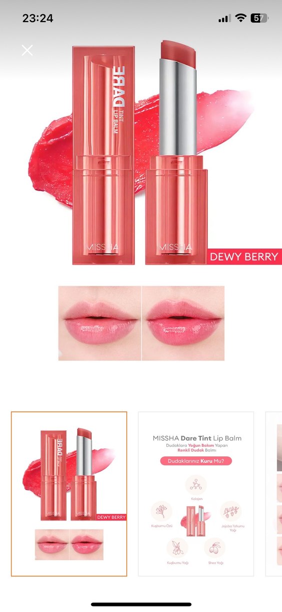 MISSHA Dare Tint Lip Balm, Dewy Berry rengiyle canlı pastel pembe tonunda parlaklık sağlar ve dudakları nemlendirir. Yoğun bakım yapar, 3-4 kere kullanıldı