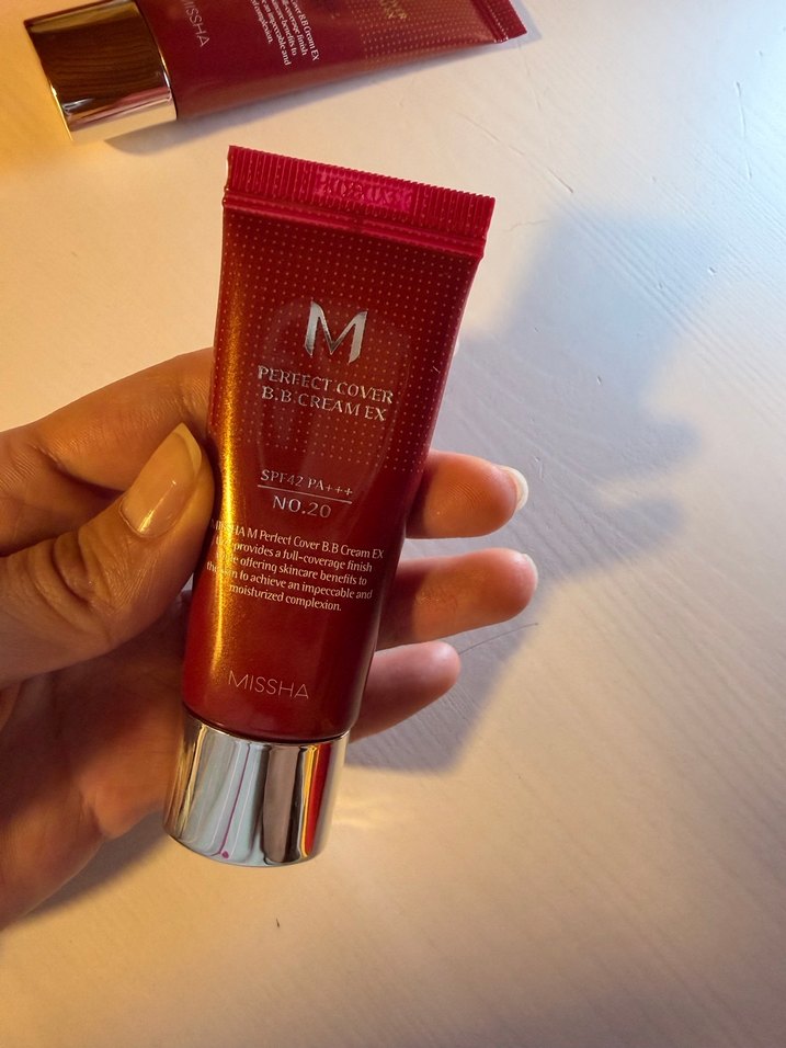 Missha'nın parlak kırmızı ambalajında Perfect Cover BB Krem No.20, SPF 42 PA++ koruma sağlar ve pürüzsüz bir cilt için kusursuz bir bitiş sunar.