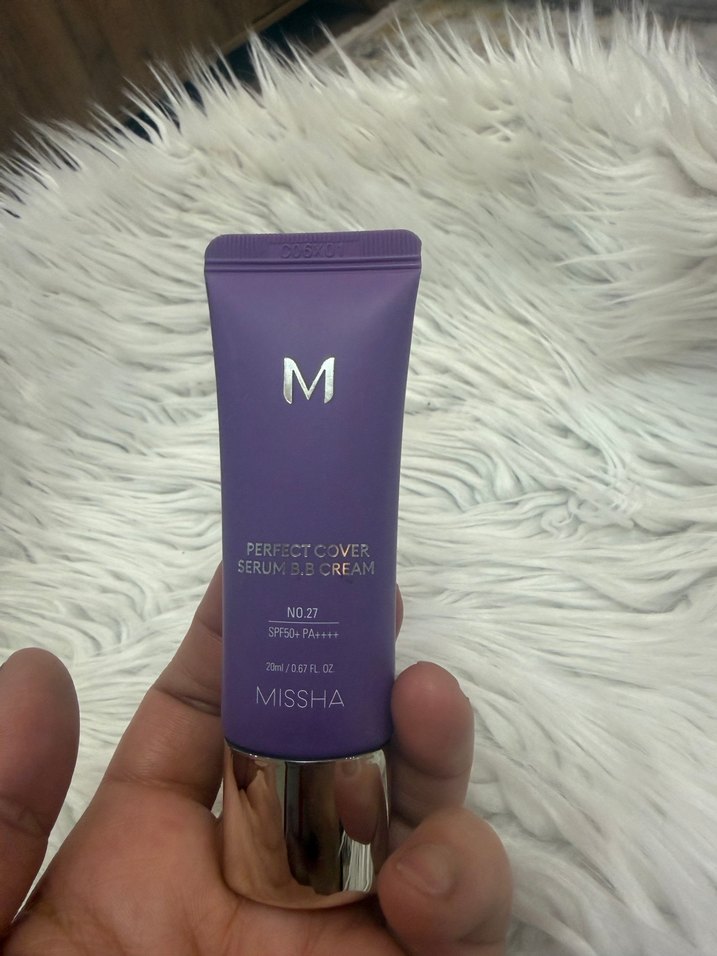 Mor renkli Missha M Perfect Cover Serum BB Krem No.27, SPF50+ koruma sağlar ve parlak bir görünüm sunar.