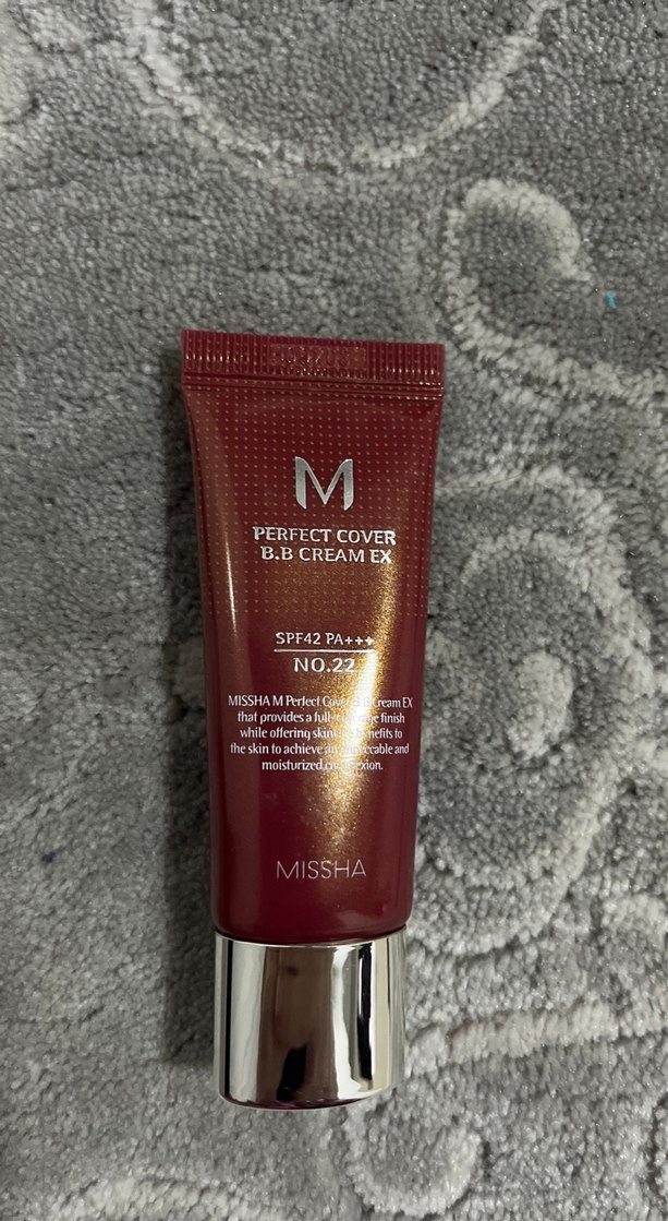 Missha Perfect Cover BB Krem No.22, parlak kırmızı ambalajda, SPF42 PA+++ koruma ile tam kapatıcılık sağlar, cildi nemlendirir ve ton eşitliği sunar.✨