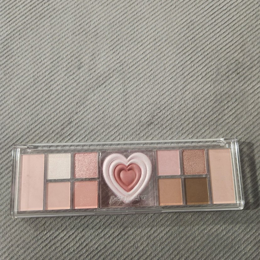 Bej ve pembe tonlarında, mat ve ışıltılı farlar içeren palet. Ortasında kalp şeklinde krem allık bulunur.