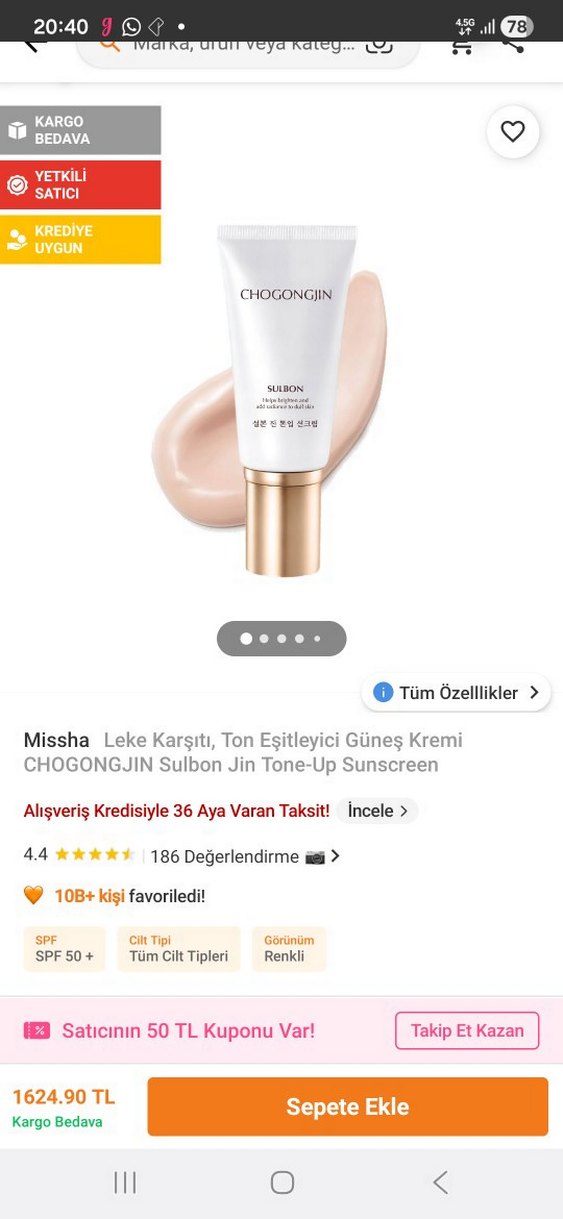 Missha Sulbon Jin Ton Eşitleyici Güneş Kremi SPF50+ ile tüm cilt tiplerine uygun, ton eşitleyici ve güneş koruyucu etkili, açık bej renkli bir kremdir.