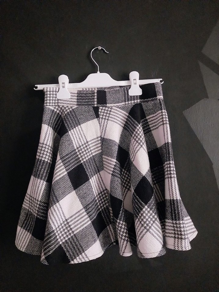 36 beden,bel 64 cm,lboy 42 cm. Gri ekose desenli,günlük sokak stiline uygun rahat bir parça.