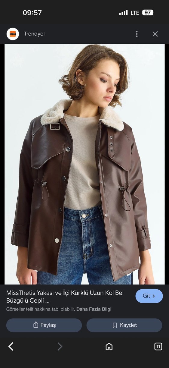 MissThetis kahverengi deri ceket, kürklü yaka ve iç detaylarıyla, uzun kollu ve bol kesimdir. Kısa boylu ve bel ayarlı, günlük kullanım için uygundur.