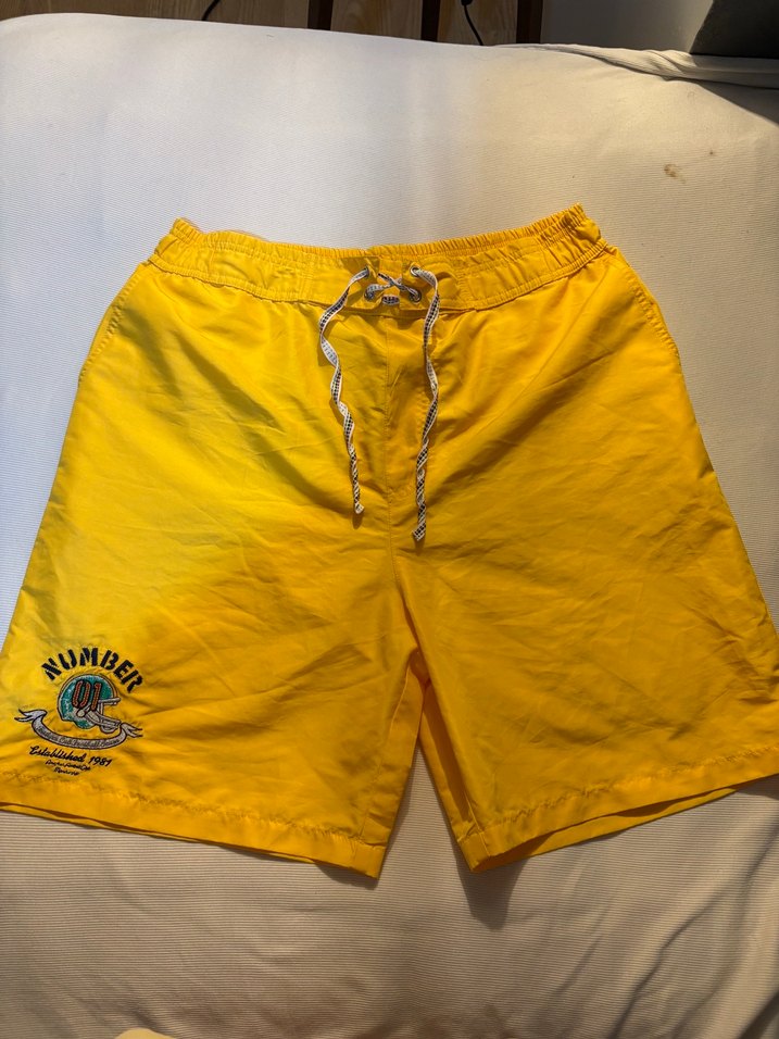 Bol kesim, elastik bel ve bağcıklı sarı erkek deniz şortu, şık plaj görünümü ve küçük logo detayıyla.
