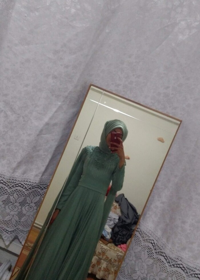 Mit yeşil elbise örgülü hazır türban hazır tul de icinde