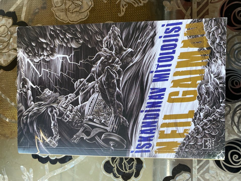 Mitoloji kitabı, eski çağlardan hikayeler içerir ve mitolojik sahneleri gösteren dramatik siyah beyaz çizimlere sahiptir.