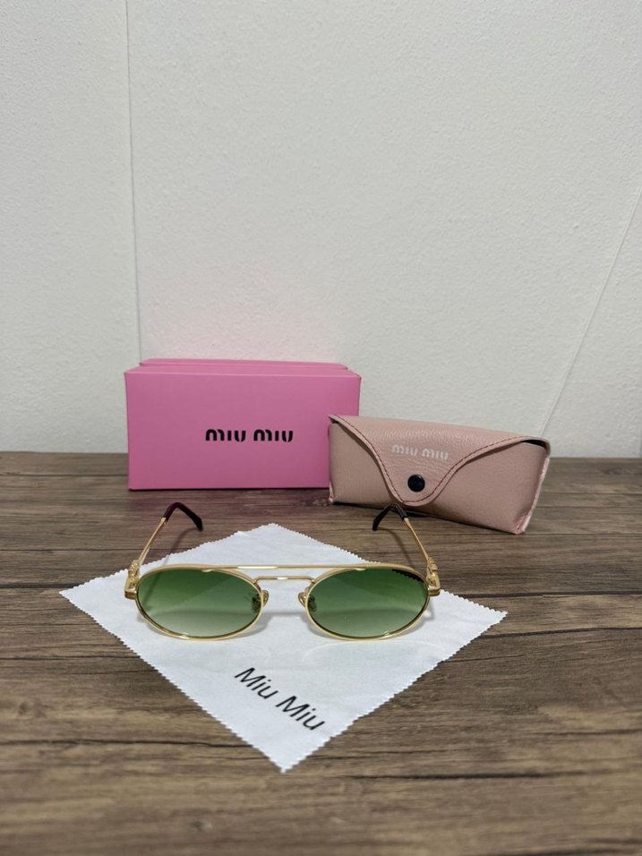 Miu Miu marka, altın çerçeveli ve pastel yeşil camlı kadın güneş gözlüğü. Minimalist tasarım ve rahat şıklık sunar. Kılıf ve bez dahil.