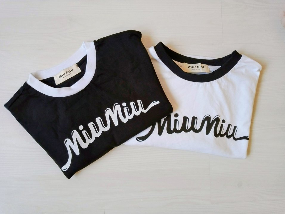 Pamuk kumaştan, baskılı Miu Miu logosu ve bisiklet yaka ile kısa kollu, vücuda oturan kısa tişört. Minimalist ve trend sokak stili görünümü sunar.