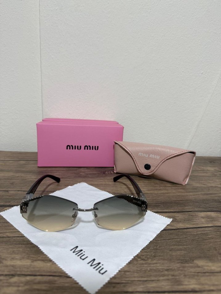 Miu Miu bej tonlarında, gri degrade camlı ve simli detaylı kadın güneş gözlüğü. Minimalist ve çağdaş tarzı yansıtır, kutu ve bez ile birlikte.