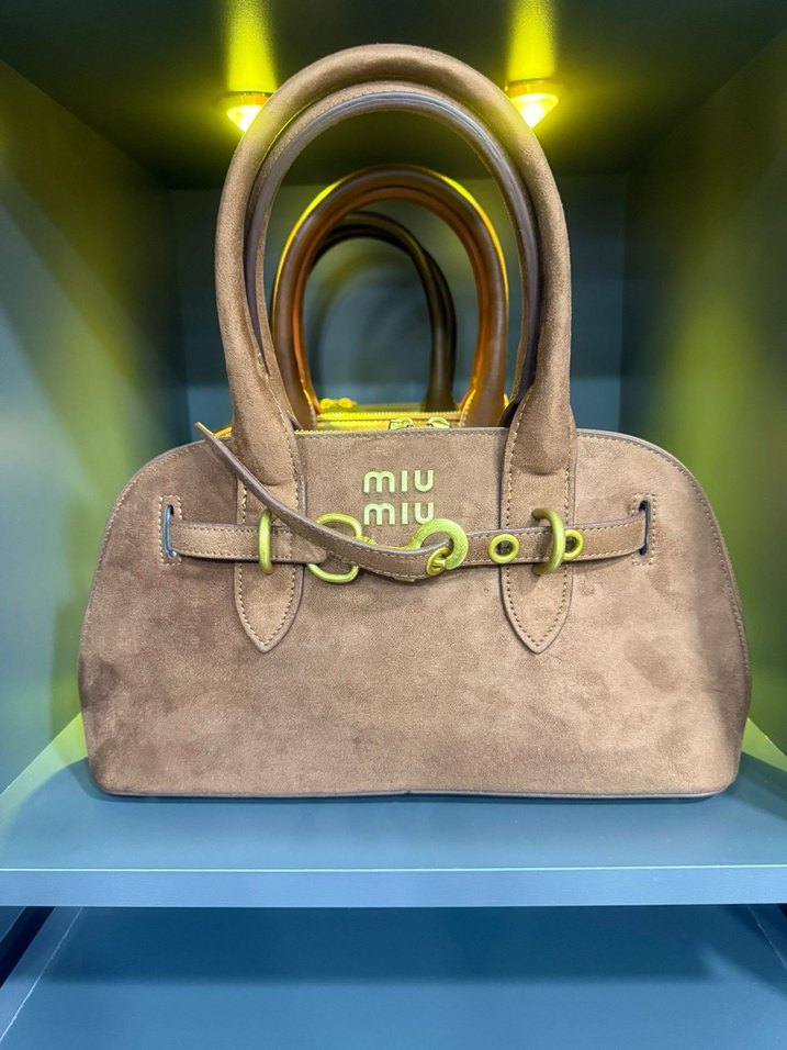 Miu Miu markalı, bej süet malzemeden yapılmış, tokalı detaylara sahip kadın çantası. Minimalist ve çağdaş tarzda, günlük kullanıma uygun.