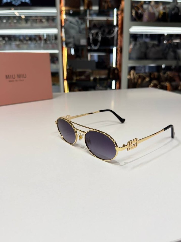 Miu Miu kadın gözlüğü, altın çerçeve ve gri camlarıyla klasik zarafeti zahmetsiz şıklıkla birleştirir.