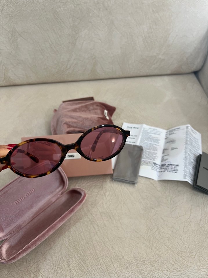 Miu Miu markalı bu kadın güneş gözlüğü, kahverengi çerçeve ve pembe lenslere sahip. Paris tarzı, kutu ve temizlik bezi ile birlikte gelir. Bu yaz aldım yüzüme uymadı, iade süresini kacirdigim için iade edemedim. Hiç kullanmadım. Faturası garantisi her şeyi mevcut.