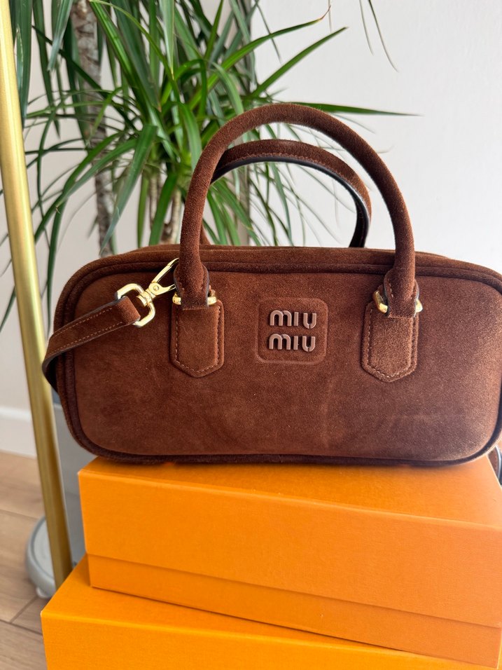 Miu Miu marka, koyu kahverengi süet kumaştan yapılmış, tokalı askılı ve minimalist, çağdaş tasarıma sahip kadın çantası. Günlük kullanıma uygun, desensiz model.