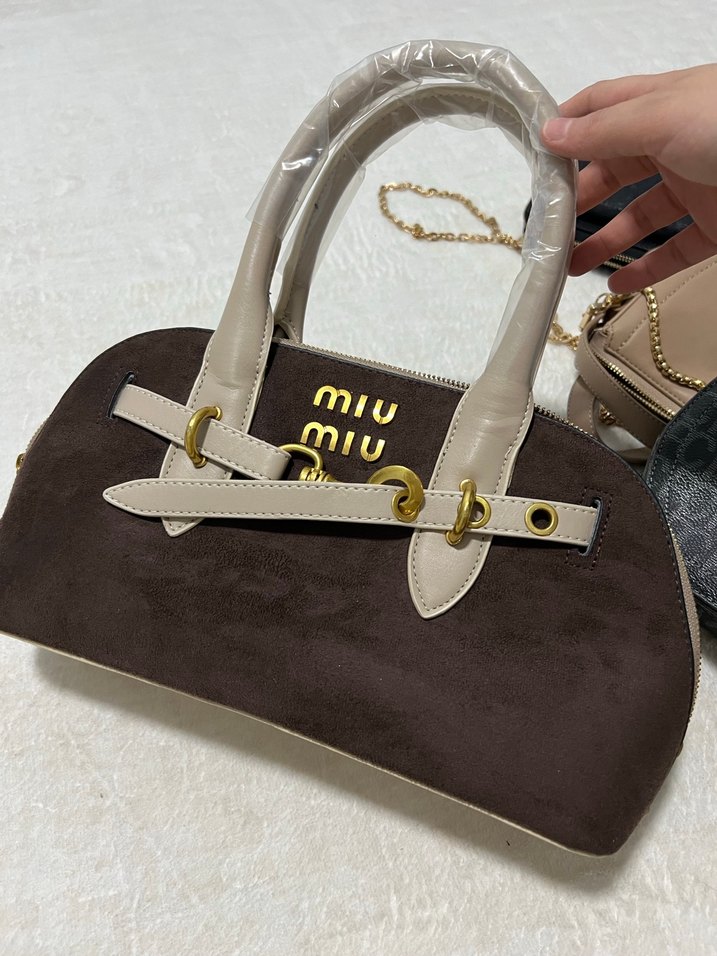 Miu Miu markalı kahverengi süet çanta, tokalı tasarımı ve parlak baskılı detaylarıyla modern klasik ve trend rahat tarzı bir arada sunar. Günlük kullanım için uygun. Hediye geldi yine abimden hiç kullanılmadı jelatinleri bile sökülmedi .