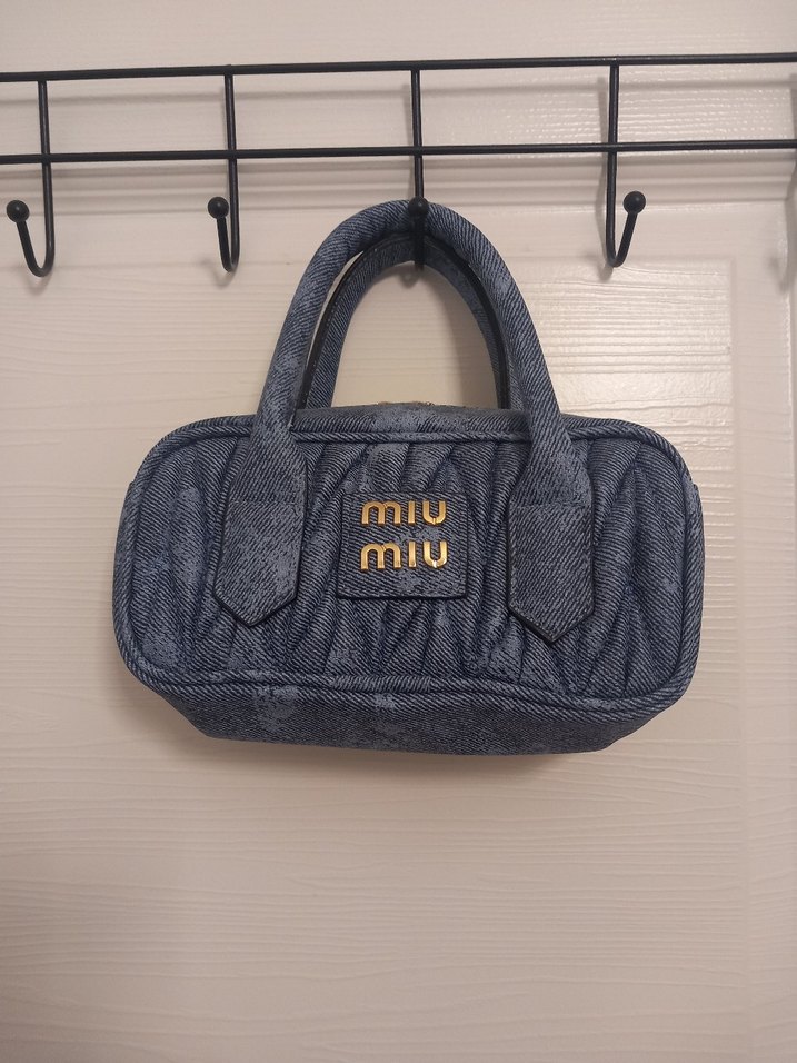 Miu Miu kadın çanta, yumuşak kot kumaştan lacivert renkte, tokalı ve baskılı detaylara sahip. Günlük sokak tarzına uygun.