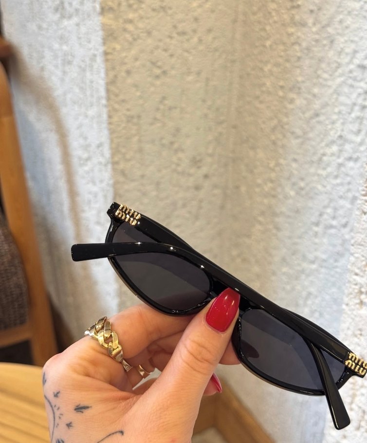 Parlak siyah, parlak detaylı ve çerçevede ince altın süslemeye sahip kadın güneş gözlüğü. Trendy günlük sokak stili için uygun.️