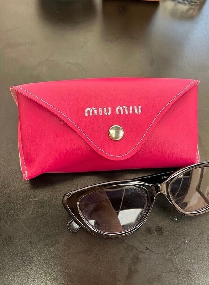 Parlak siyah Miu Miu kadın gözlük, koyu renkli camlarla , fakat sağ iç tarafa yapıştırıcı döküldü o yüzden uygun fiyata