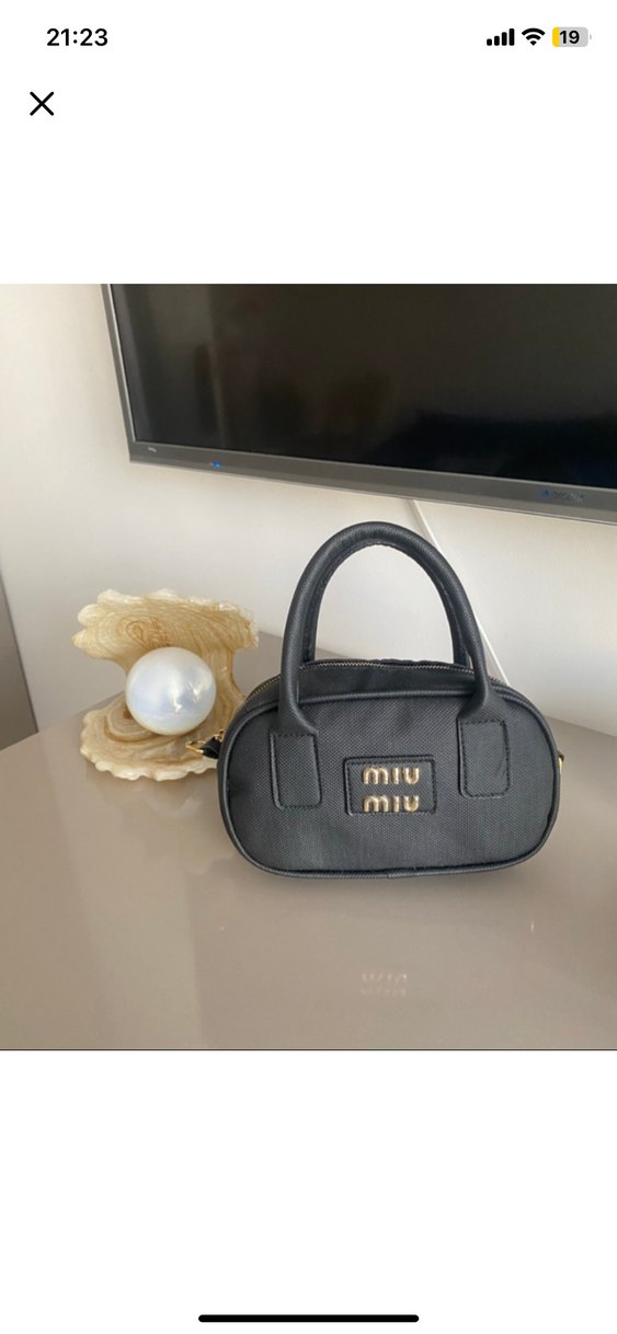 Miu Miu siyah deri çanta, modern klasik tasarım, baskılı desen ve tokalı detaylarla minimalist ve şık bir görünüm sunar.