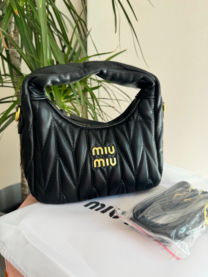 Miu Miu logosu bulunan siyah deri, fermuarlı ve kadın çanta. Trend sokak stiline uygun.