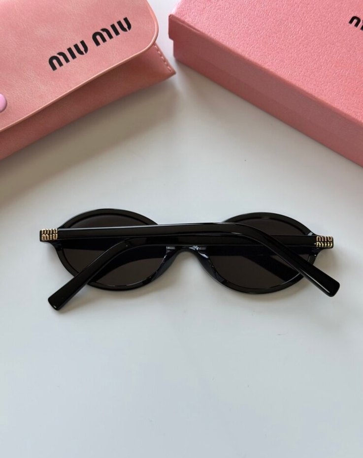 Miu Miu siyah çerçeveli güneş gözlüğü, koyu renkli camlarla klasik ve zarif bir görünüme sahiptir. Pembe kılıf ve kutu ile birlikte gelir. ️
