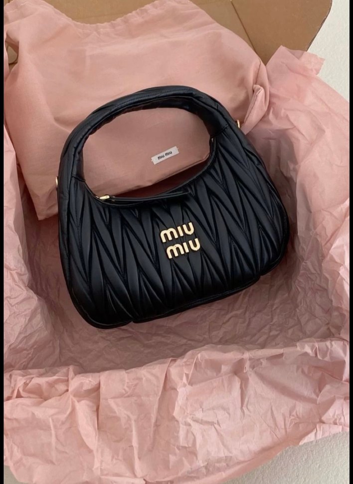Miu Miu marka siyah kadın çantası, pliseli tasarımı ve baskılı logosu ile trend sokak stiline uygundur.