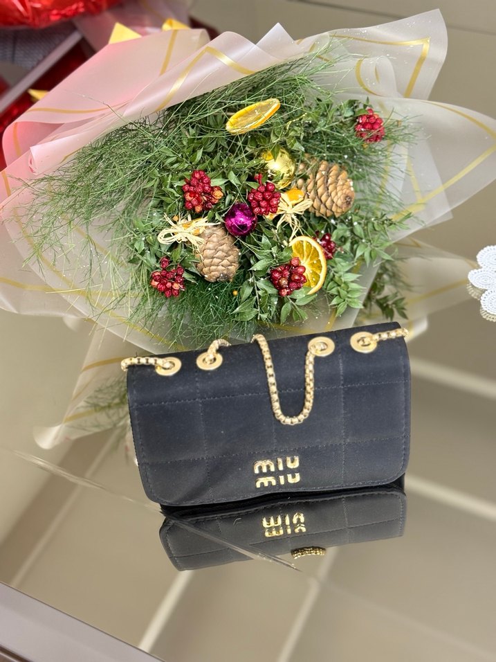 Miu Miu'nun çiçek desenli, zincir detaylı koyu renkli süet çantası, romantik akşamlar için klasik zarafeti yansıtıyor.
