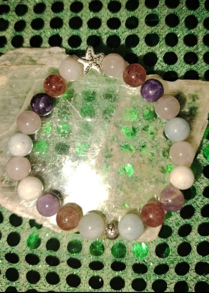 Akuamarin, Ay taşı, Kunzit, Amatist, Çilek Kuvars taşları kullanılmıştır. Hepsi orijinal taşlardır. Şansı ve sevgiyi kendine çek, huzurda kal
