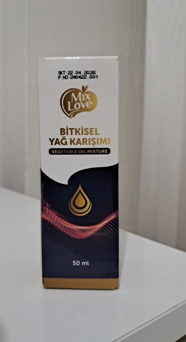 Mix Love bitkisel yağ karışımı, 50 ml, altın ve koyu renkli ambalajda. Doğal yağların karışımıdır.