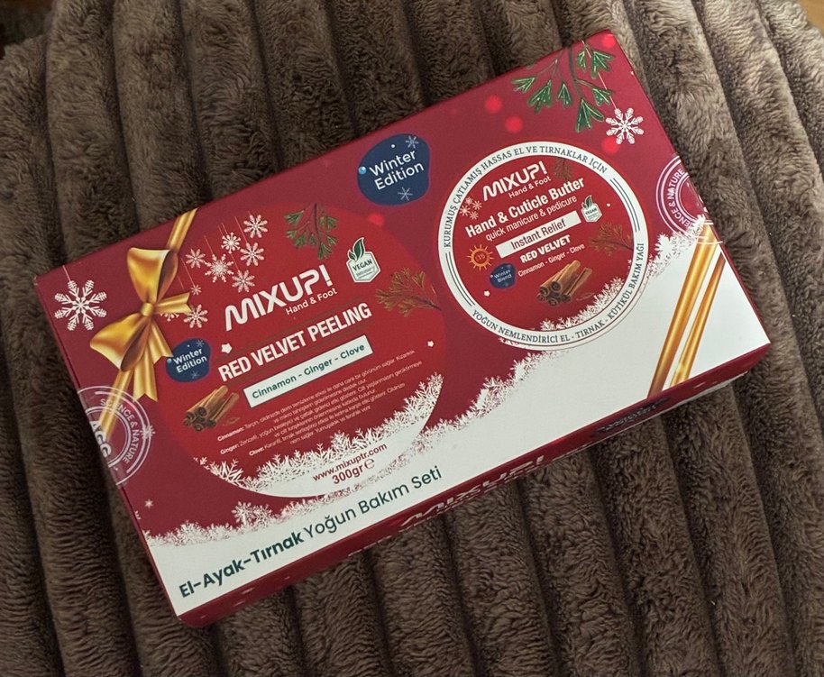 MIXUP! Red Velvet Peeling ve El-Ayak-Tırnak Yoğun Bakım Seti, tarçın, zencefil ve karanfil ile eller, ayaklar ve tırnaklar için yoğun bakım sağlar. Kış edisyonu. ❄️