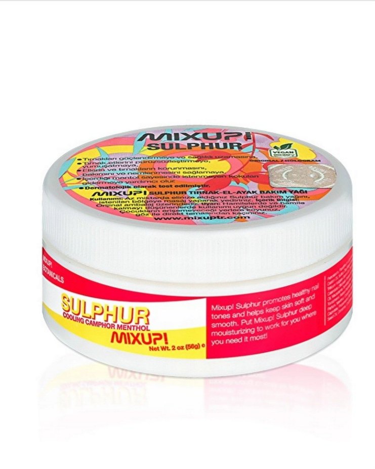 Mixup! Sülfür, mentol ve kafur içeren krem sağlıklı cilt ve yumuşak tirnaklari nemlendirir ve ferahlatır.
