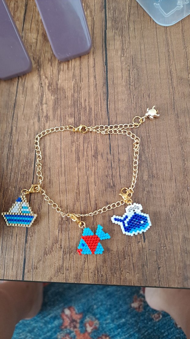 Bu bohem tarz bileklik, renkli boncuk işlemeli balık ve tekne figürleri ile zarif altın zincirden oluşur. Günlük kullanım için uygundur. halhal ya da bileklik isterseniz kolye charmlardan olusan kendin yarat halhal