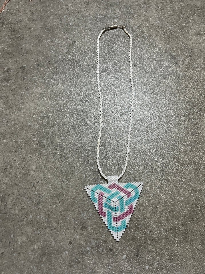 miyuki boncuklu üçgen kolye, hic kullanılmamıştır el emeğidir, Uzun, çok renkli boncuklu ve işlemeli desenli üçgen kolye, bohem tarzıyla günlük kullanıma uygun.