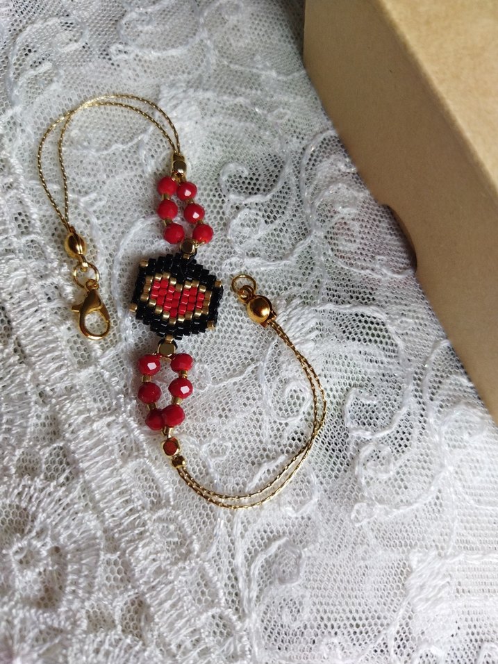 Miyuki boncuklara sahip kırmızı kalp desenli bohem tarzı bileklik. İnce altın renk çelik zincir ve kapama içerir.El yapımı olup sıfır üründür.Marka temsilidir.