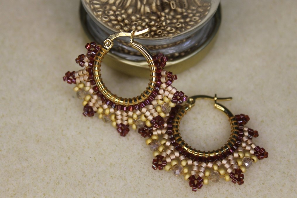 Bordo işlemeli desenli, boncuk detaylı bohem tarzı mini kısa uzunlukta küpeler. Düğün için uygun, retro ve hippie havası taşıyor.