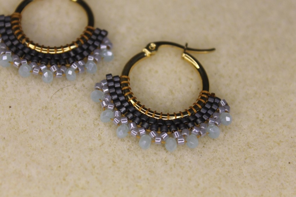 Gri boncuk işlemeli, altın renkli kısa halka küpeler. Bohem tarzıyla romantik akşamlar için uygun.